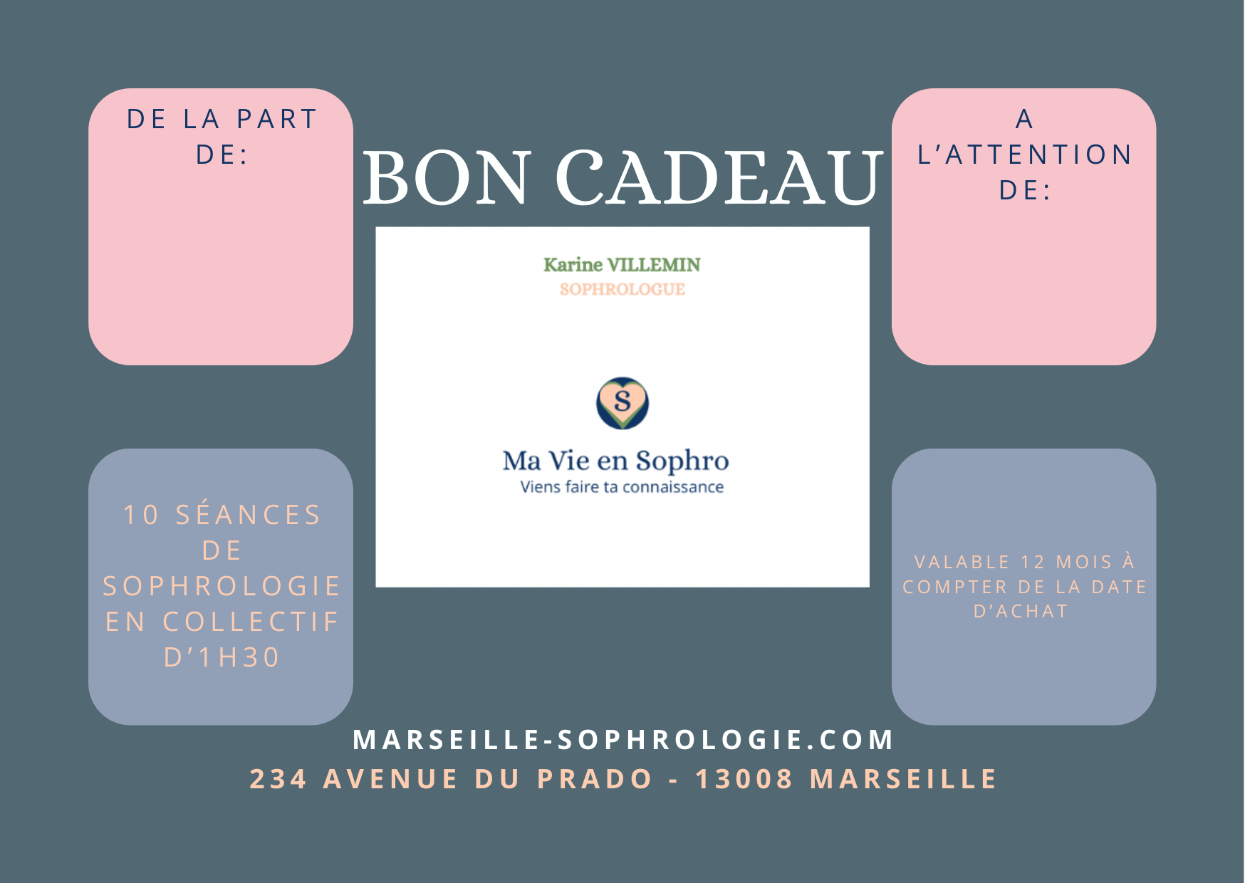 bon cadeau d'une valeur de 239€ pour 10 séances de sophrologie en collectif au cabinet de Karine VILLEMIN Sophrologue - 234 avenue du PRADO 13008 MARSEILLE - le samedi matin