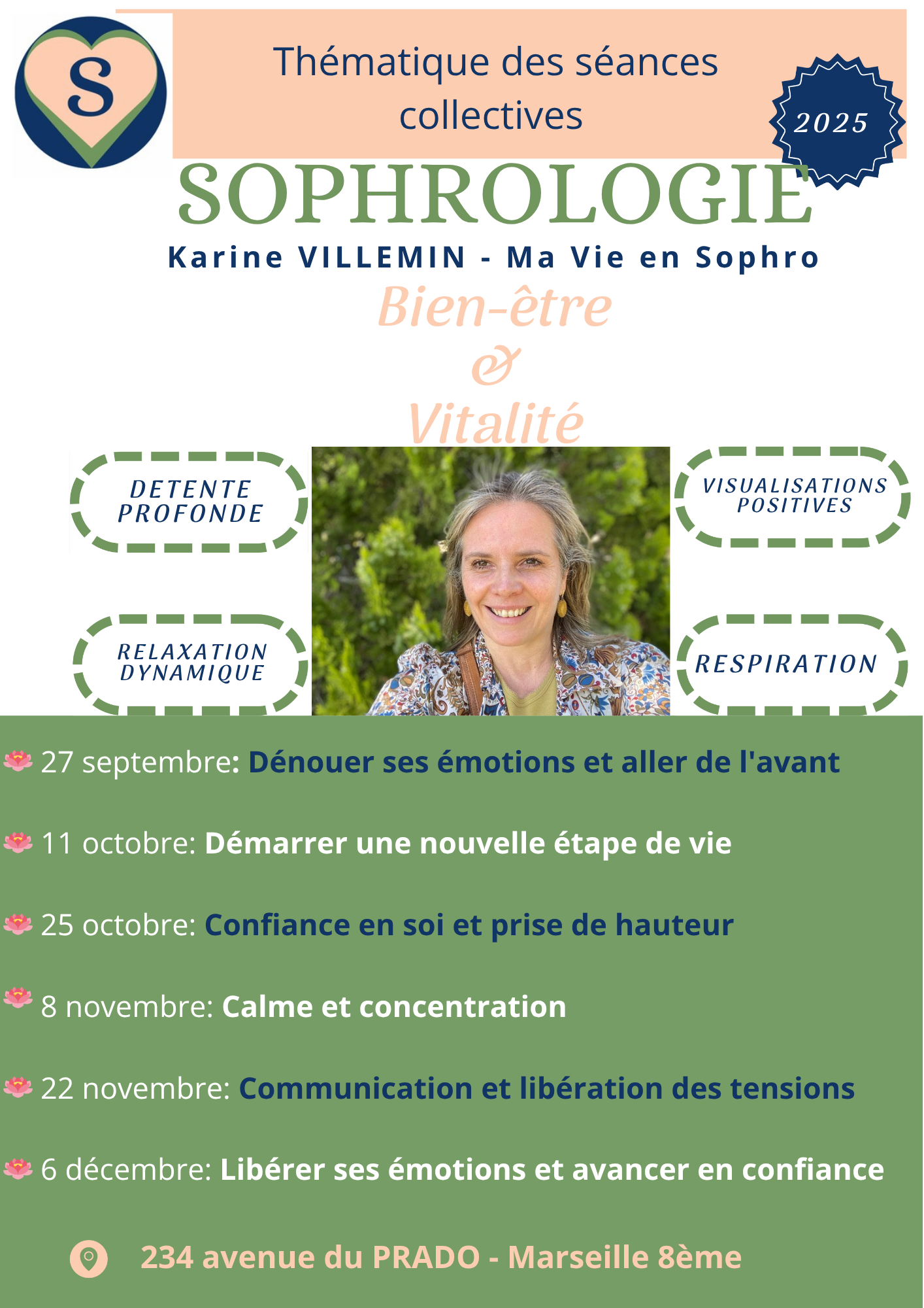 DEROULE DE L'ATELIER Les ateliers démarrent toujours par une information pré-sophronique, c'est l'occasion de vous expliquer ce qui vous attend pendant cette séance collective de sophrologie et vous répondre à vos questions si c'est la première fois que vous pratiquez la sophrologie.